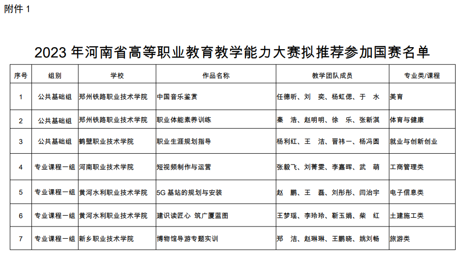 附件:1.2023年河南省高等职业教育教学能力大赛拟推荐参加国赛名单