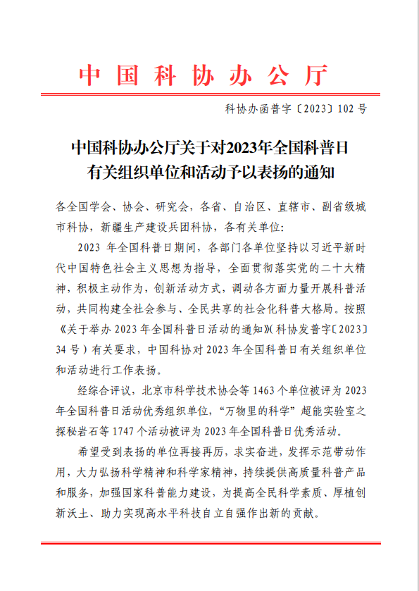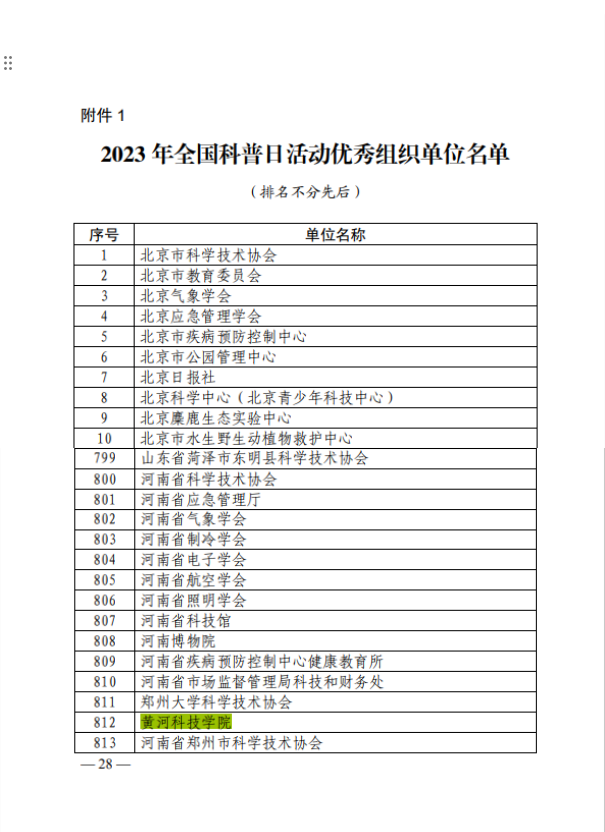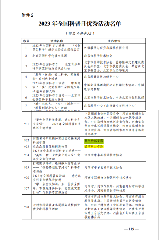近日,中国科协公布2023年全国科普日活动考核结果,黄河科技学院获评2023年全国科普日优秀组织单位,河南省共有两所高校获此殊荣;“河南省科学家精神宣讲团走进黄河科技学院”“应急急救技能培训进校园”两项科普活动获评2023年全国科普日优秀活动。