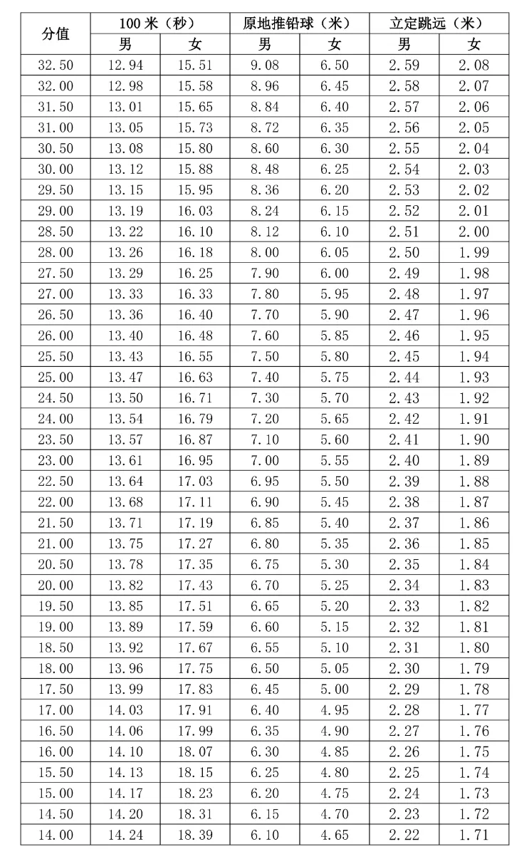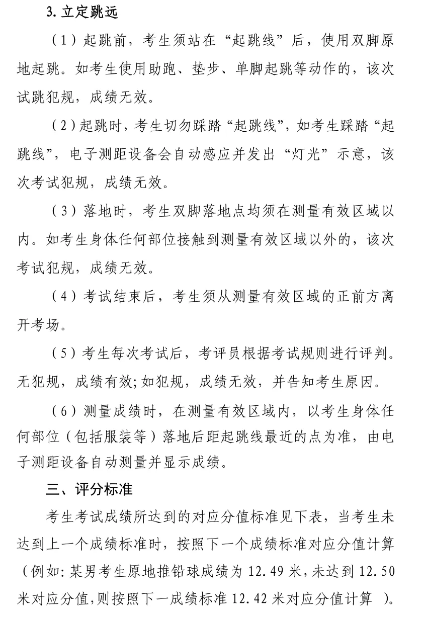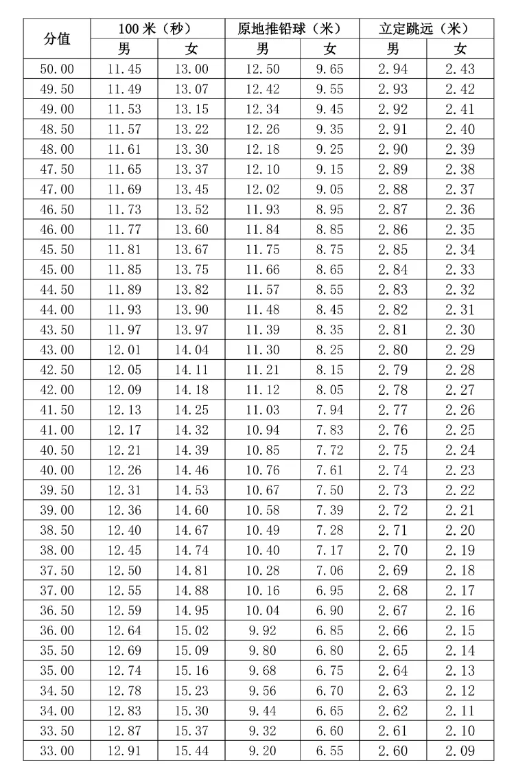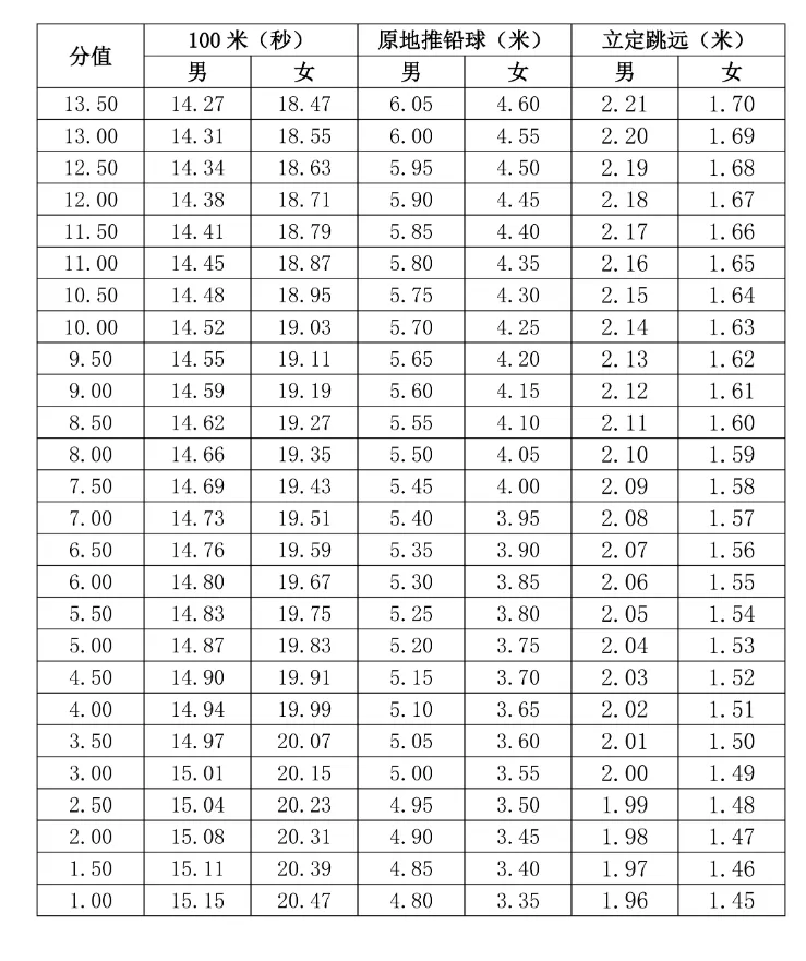 2.考试内容为:100米、原地推铅球、立定跳远三个考试项目。