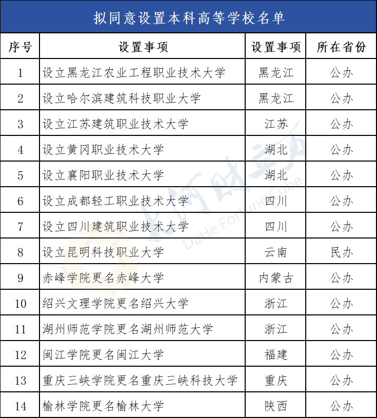 【大河财立方消息】 1月12日,教育部发布关于拟同意设置本科高等学校的公示。